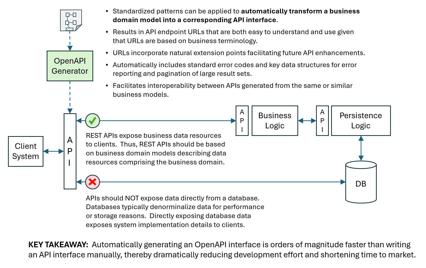 A web-based toolset that dramatically reduces the time and effort required to create REST APIs. The toolset provides two key capabilities: 1) a REST API client interface generator that transforms a graphical business domain data model into an OpenAPI client interface specification and 2) a code generator that creates API foundational code (API controllers, data schema objects, interface annotations) from an OpenAPI specification. The result is a fully-functional REST API that can be extended with business logic to create a production-quality API in a fraction of the time required by traditional development approaches. Click here for more information and to request a free trial license.