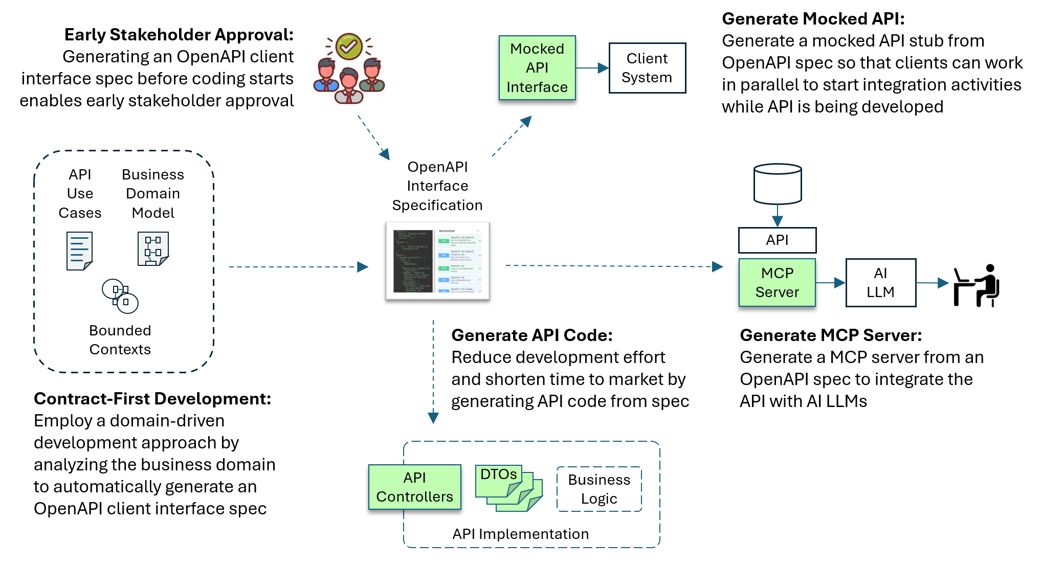 A web-based toolset that dramatically reduces the time and effort required to create REST APIs. The toolset provides two key capabilities: 1) a REST API client interface generator that transforms a graphical business domain data model into an OpenAPI client interface specification and 2) a code generator that creates API foundational code (API controllers, data schema objects, interface annotations) from an OpenAPI specification. The result is a fully-functional REST API that can be extended with business logic to create a production-quality API in a fraction of the time required by traditional development approaches. Click here for more information and to request a free trial license.